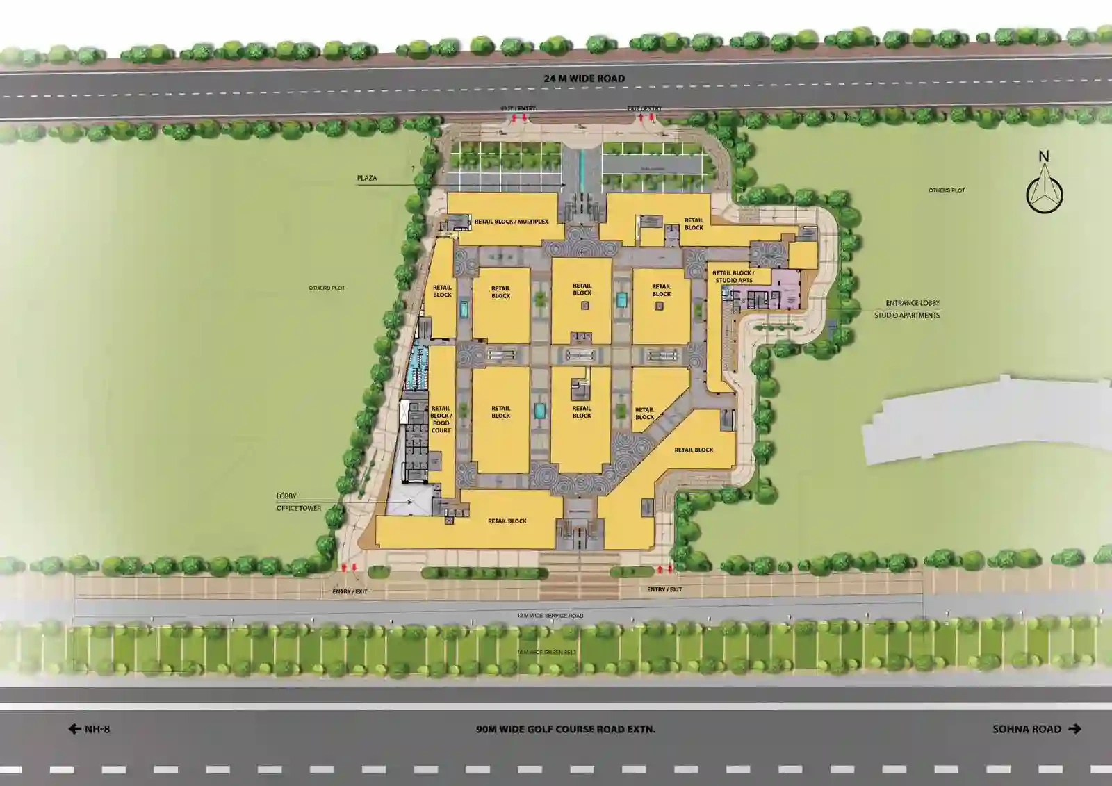 The project is equipped with modern commercial infrastructure including high speed elevators, power backup and advanced fire safety systems. Ample parking space is provided for visitors and occupants. Landscaped open areas and pedestrian friendly zones enhance the overall experience. Round the clock security and professional facility management ensure safe and smooth operations within the complex.