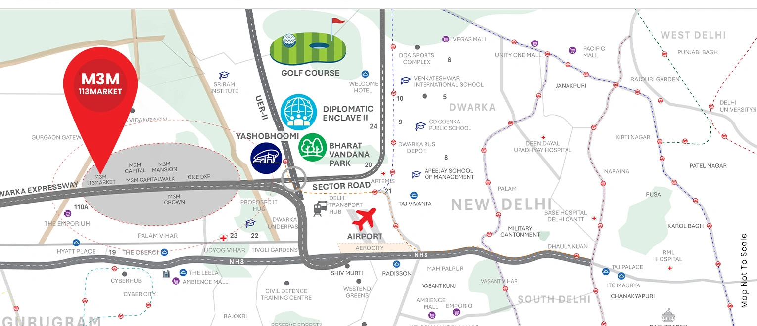 WATER FOUNTAINFor the first time in India, M3M has introduced commercial land in New Gurgaon. Located in prime locations in Sector 84 (6 Acres) and Sector 113 (8 Acres) of Gurgaon. All a project needs to be successful and effective in the long run is the perfect location and M3M SCO has it! Direct access from the 150-meter-wide Dwarka highway. Also known as the Northern Peripheral Road, the 150-meter-wide Dwarka Expressway connects State Highway 8 with Delhi at Dwarka, offering the advantage of a prime location. Owners can also build retail stores, restaurants, or offices and rent them out to brands as needed. In addition, M3M India Group will also provide leasing support for this property. The M3M SCO store makes shopping convenient for those who live close to over 1000 acres as there are no such markets in the area nearby.