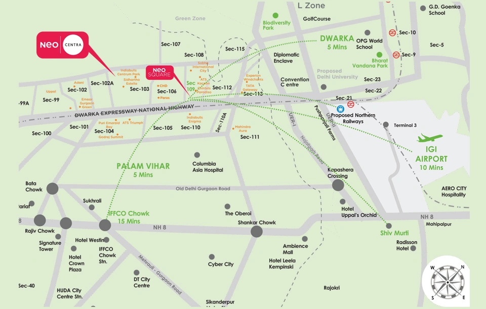 Easy connectivity with Dwarka, IGI Airport and NH-8 & convenient access from UER-I & UER-II.