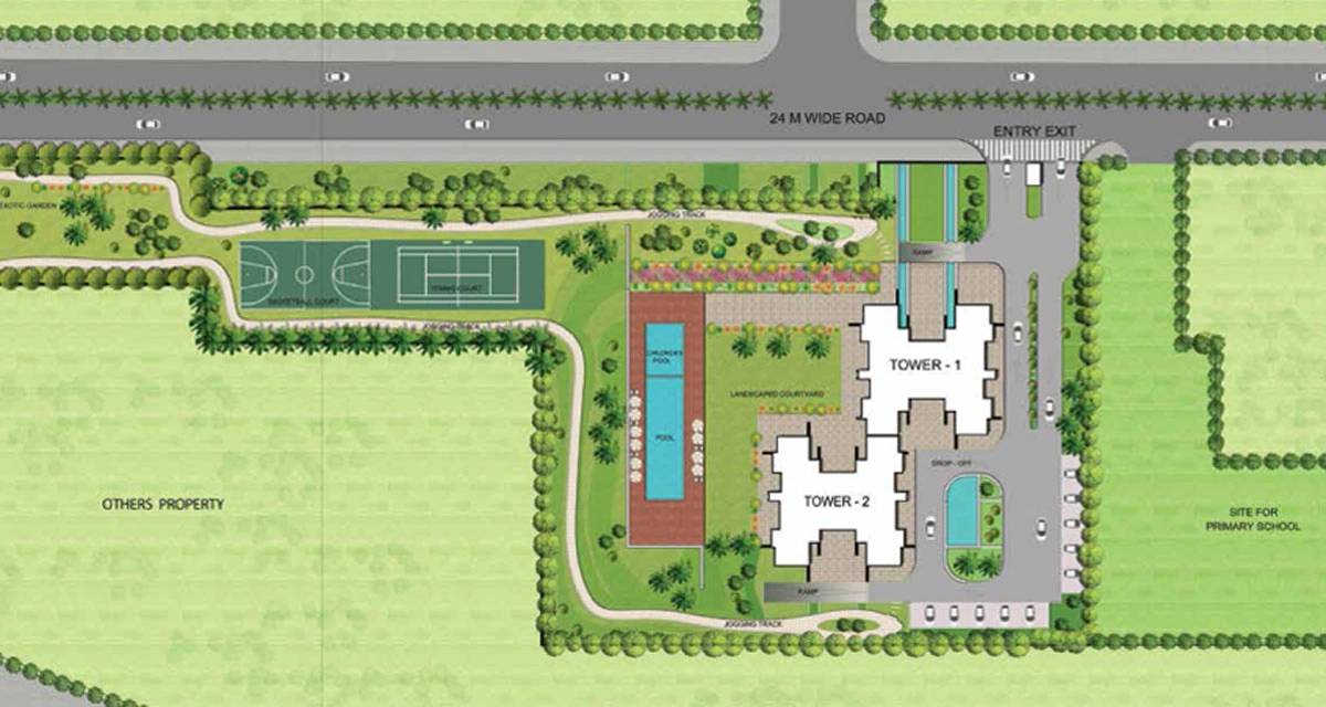 The project includes a clubhouse with recreational facilities such as a swimming pool, gymnasium, indoor games and social spaces. Landscaped gardens, jogging tracks, children’s play areas and open green zones create a pleasant environment. The development is equipped with 24x7 security, power backup, high speed elevators and professionally managed common areas to ensure safety and convenience. Dedicated parking spaces are provided for residents and visitors.