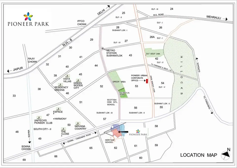 The area around Pioneer Presidia, Gurgaon in the golf course extension includes Urban Square, Pioneer Park Araya, BPTP Centra One, Digital Greens