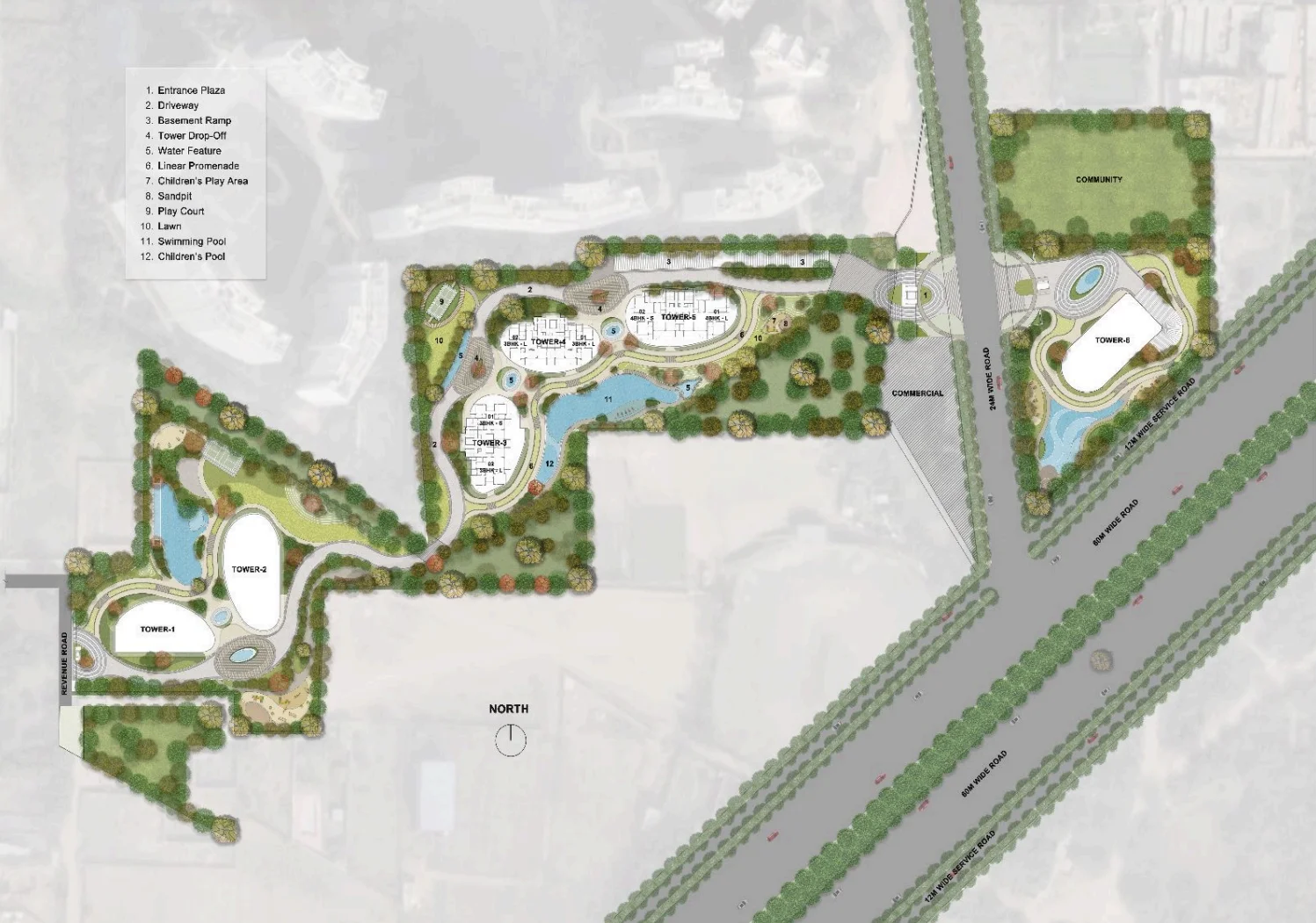Swimming pool, landscaped gardens, kids’ play zones, multipurpose halls.