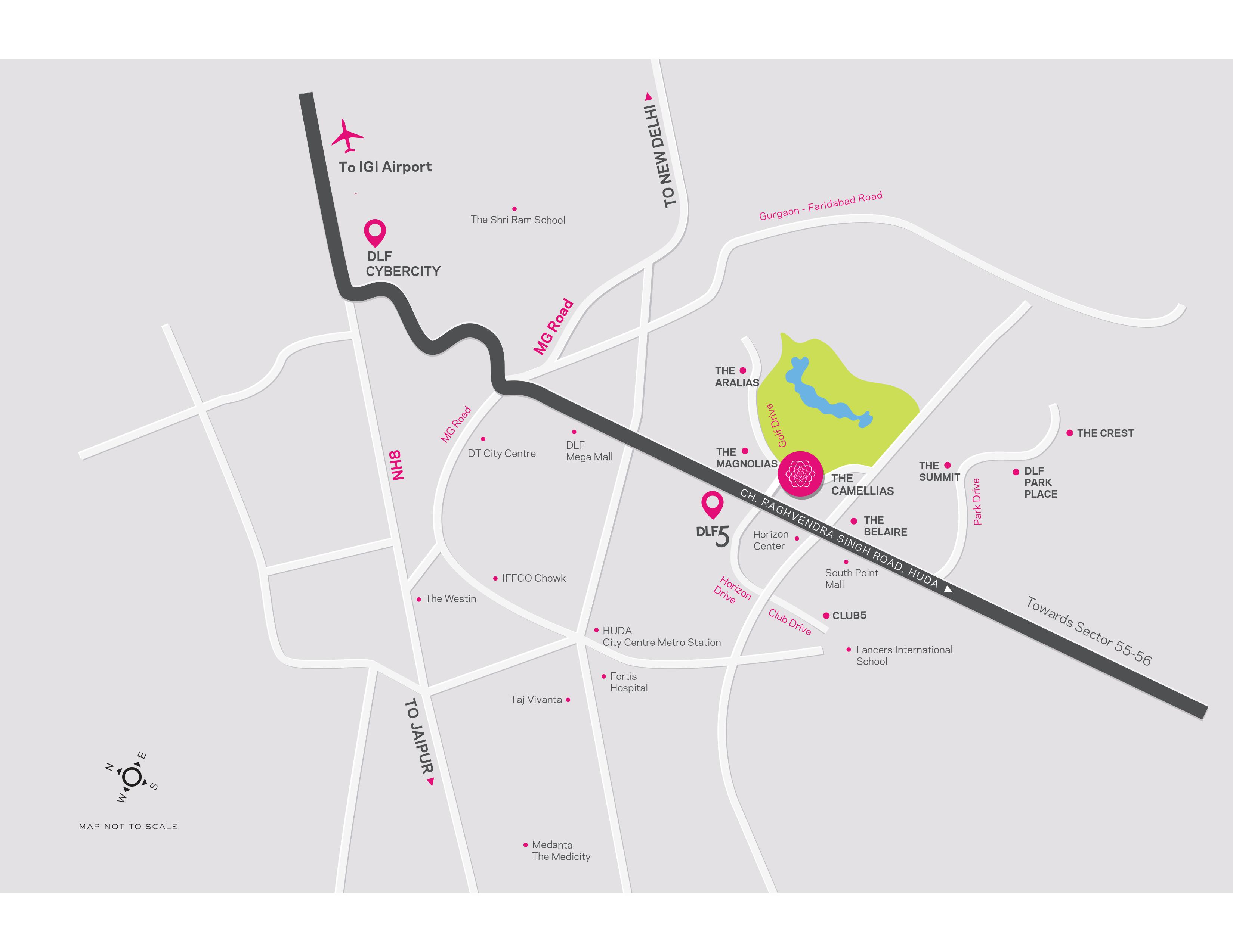Traveling to and from DLF Camellias, you're not just a short distance from the city center. DLF The Camellias is nestled in the most beautiful part of the Golf Course. Everything you are looking for is a short distance away, you can reach the rest of India via NH-8 and Delhi International Airport.